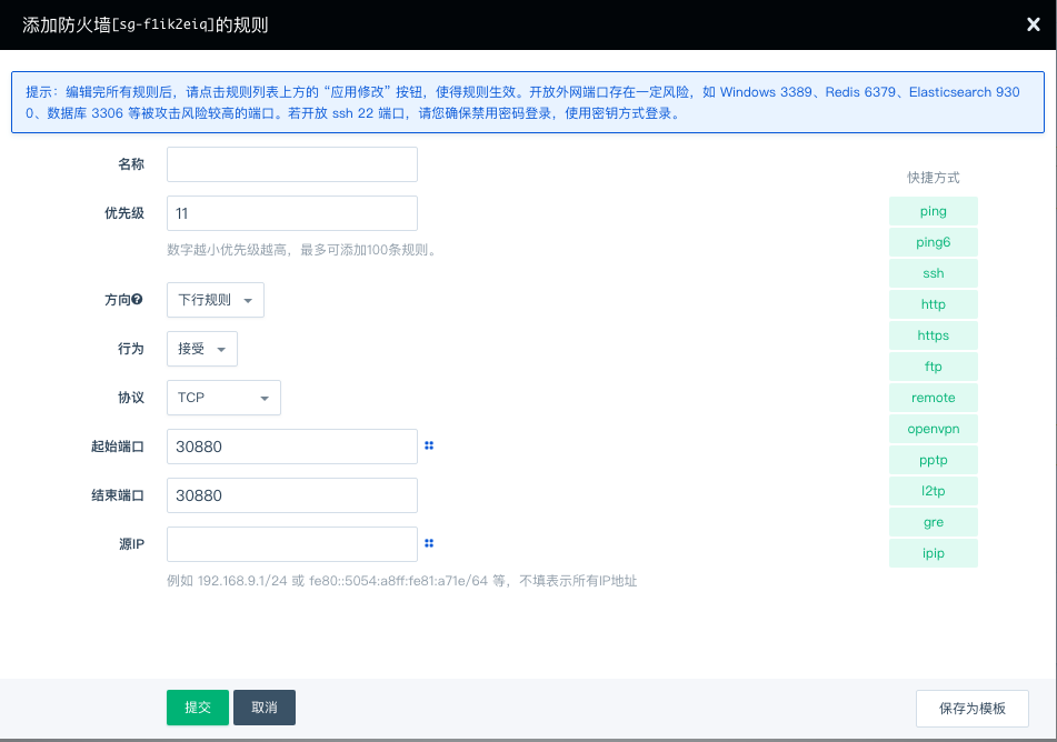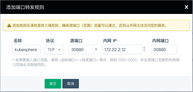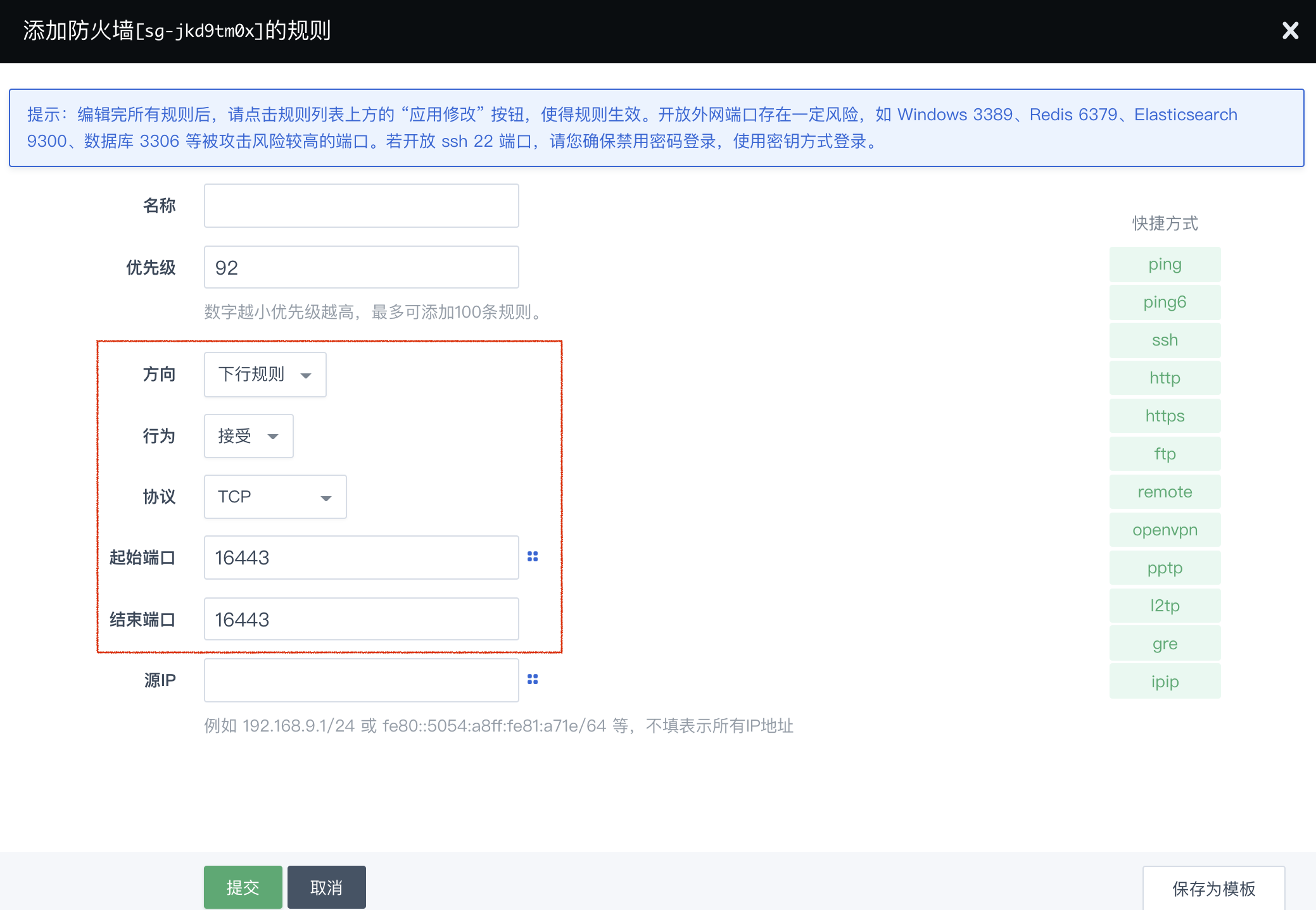 基础网络部署请将集群缺省防火墙开通 6443 和节点端口范围(默认为 30000-32767,请以创建集群时选择的范围为准)。