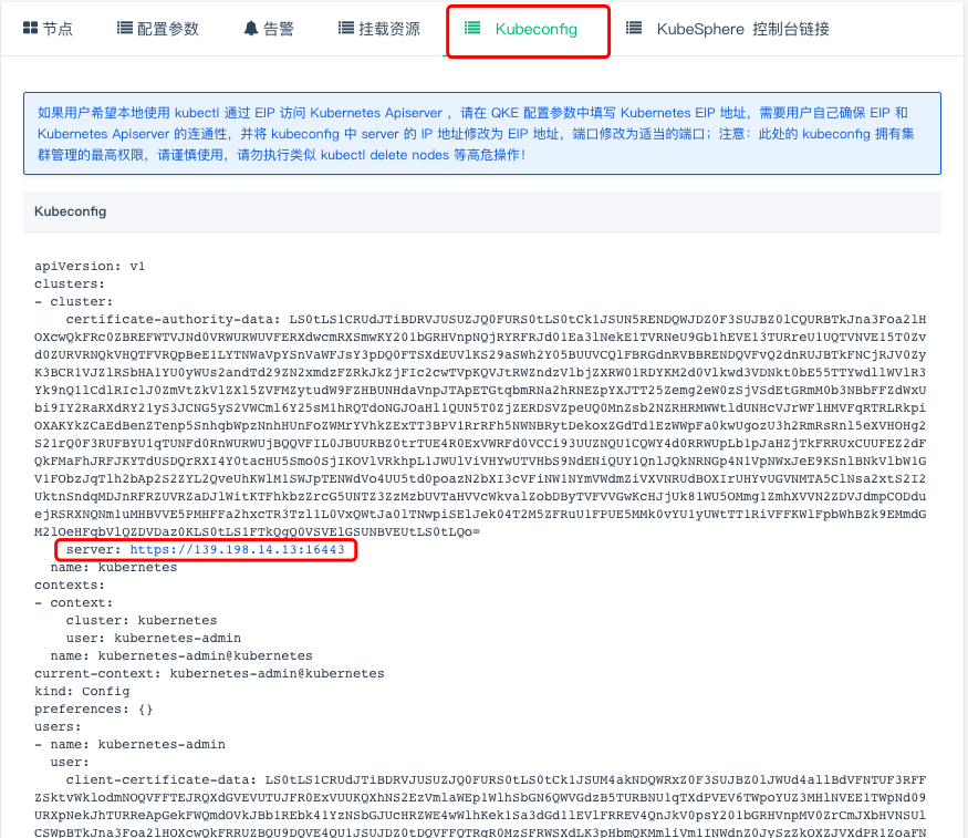 - 在 Qingcloud 控制台显示 Kubeconfig