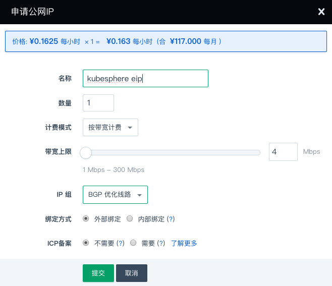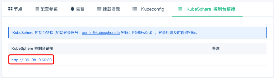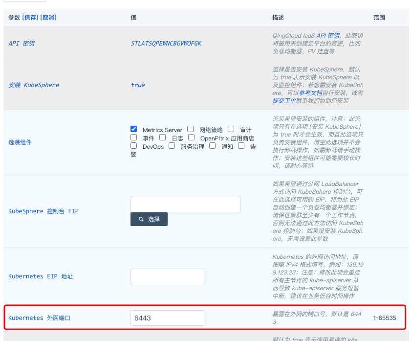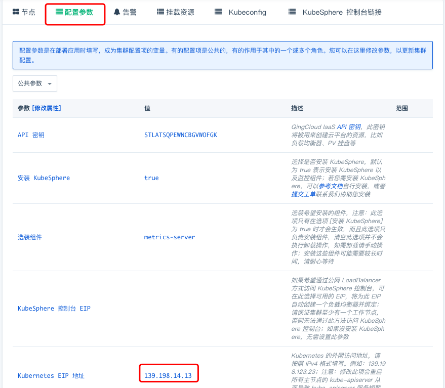 | KubeSphere 控制台 EIP | 如果希望通过公网 LoadBalancer 方式访问 KubeSphere 控制台,可在此选择可用的 EIP,将为此 EIP 自动创建一个负载均衡器并绑定;如果没安装 KubeSphere,无需设置此参数 |