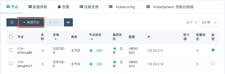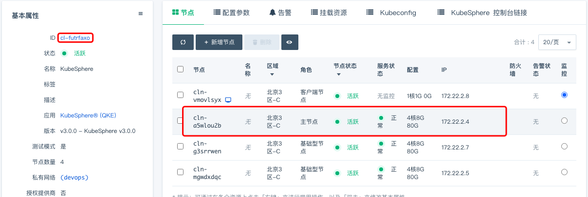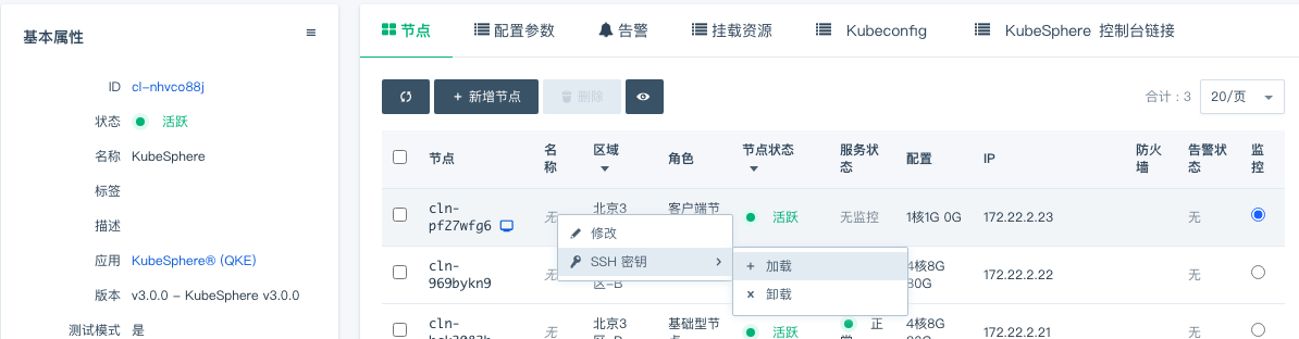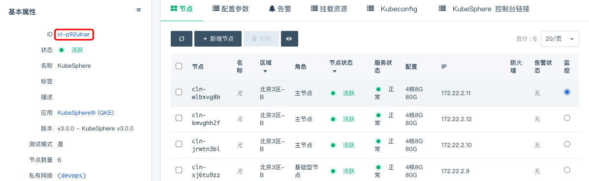 注意:默认情况下 QKE 执行 KubeSphere 最小化安装(只包含监控组件),如需开启全部组件,需要创建工作节点(云平台挂盘限制,每台主机最多挂载 10 块普通硬盘,而完整安装 KubeSphere 共需要 11 块硬盘)。