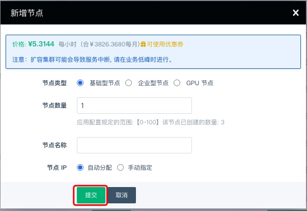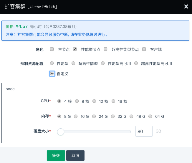 可以通过选择上面的快速配置组快速创建集群,也可根据自身需求选择自定义方式配置节点。如果选择自定义方式,需要注意至少要创建 2 个与主节点主机类型一致的工作节点(都是基础型或都是企业型),其他主机类型的节点可按需创建。