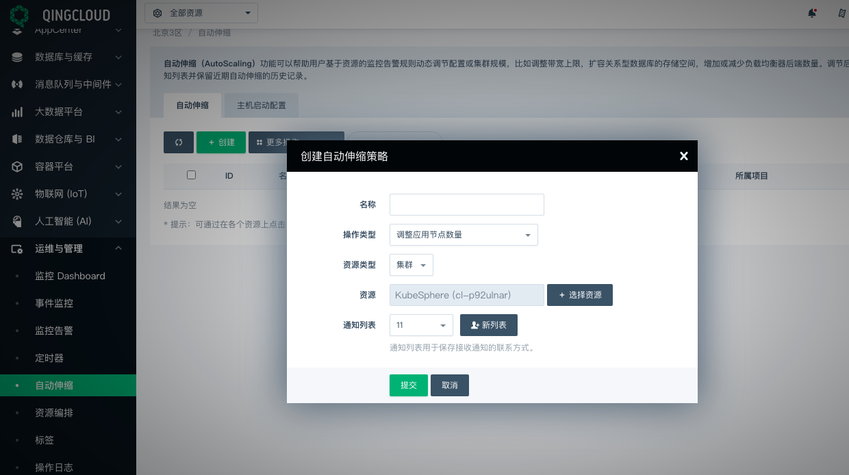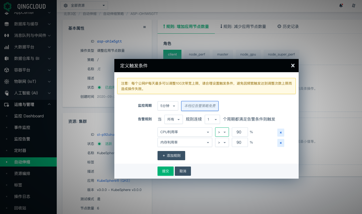 - 支持集群节点自动弹性伸缩,根据资源指标数据的变化,自动完成节点的增减