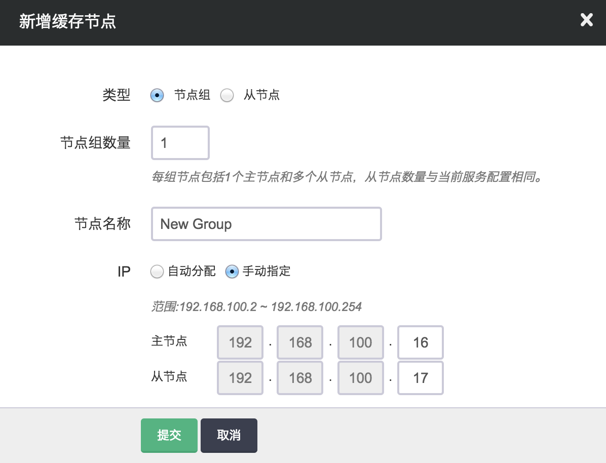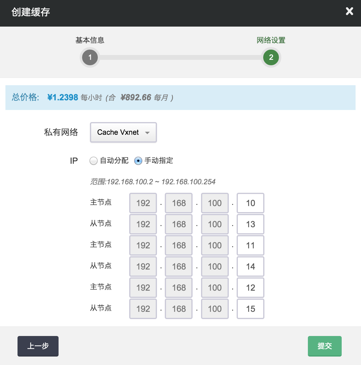 在配置网络的过程中,我们首先需要选择缓存服务要加入的私有网络。 然后我们可以为缓存服务中的每个节点指定 IP,例如我们指定 主节点的 IP 为 192.168.100.10,192.168.100.11,192.168.100.12,从节点的 IP 为 192.168.100.13,192.168.100.14,192.168.100.15。 您也可以选择”自动分配”,让系统自动指定 IP。