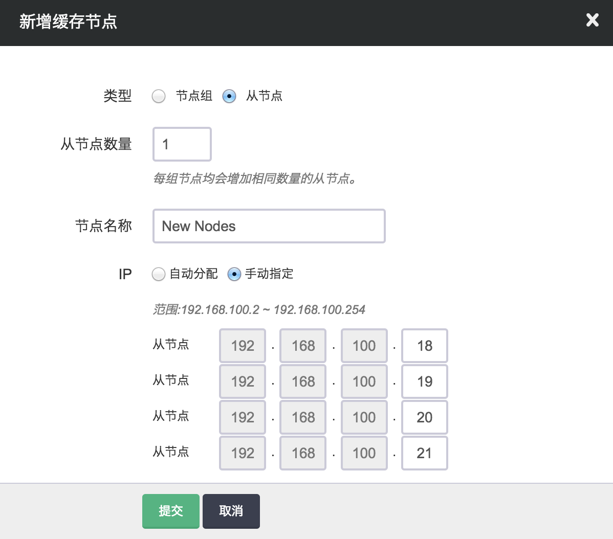 Redis 集群服务每个主节点可以支持多个从节点。当读的能力不足时,您可以通过增加缓存从节点来提升读性能。 如图所示,我们在原有集群基础上新增一个从节点,并在创建时为新节点指定 IP,这个新增节点数 (replicate) 是针对于每个主节点而言, 因此该示例中总共要创建 4 个从节点(每主一个)。
