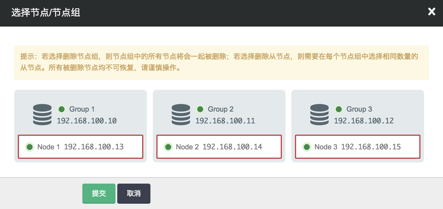 如果写服务能力或容量过剩,也可以删除多余的节点组,即删除主节点和它的所有从节点,删除的过程中系统会自动迁移数据到其它节点中,因此时间会稍长一点。