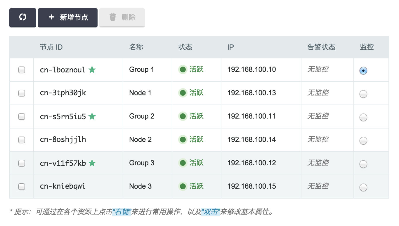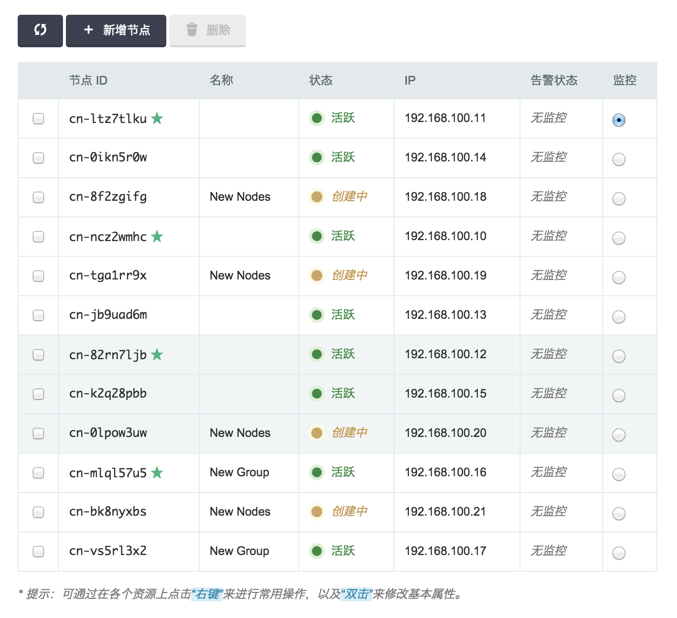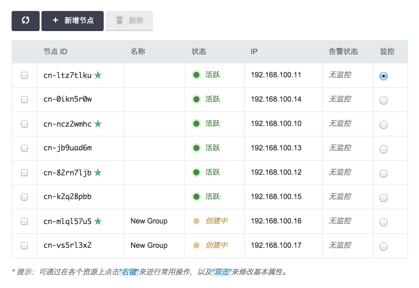 当缓存服务创建完成之后,我们可以查看缓存节点的运行状态。 如图所示,缓存节点的 IP 为我们指定的 IP 地址,同时为 “活跃” 状态,表示各缓存节点连接正常。