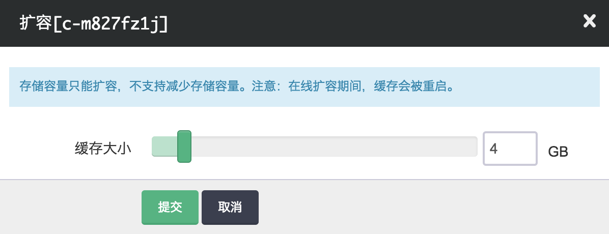 注解 存储容量只能扩容,不支持减少存储容量。在线扩容期间,缓存服务会被重启。