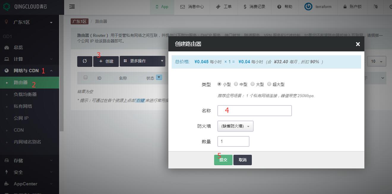在控制台上,网络与 CDN ‣ 路由器 ‣ 创建 ‣ 填入路由器名称 ‣ 提交,见下图步骤: