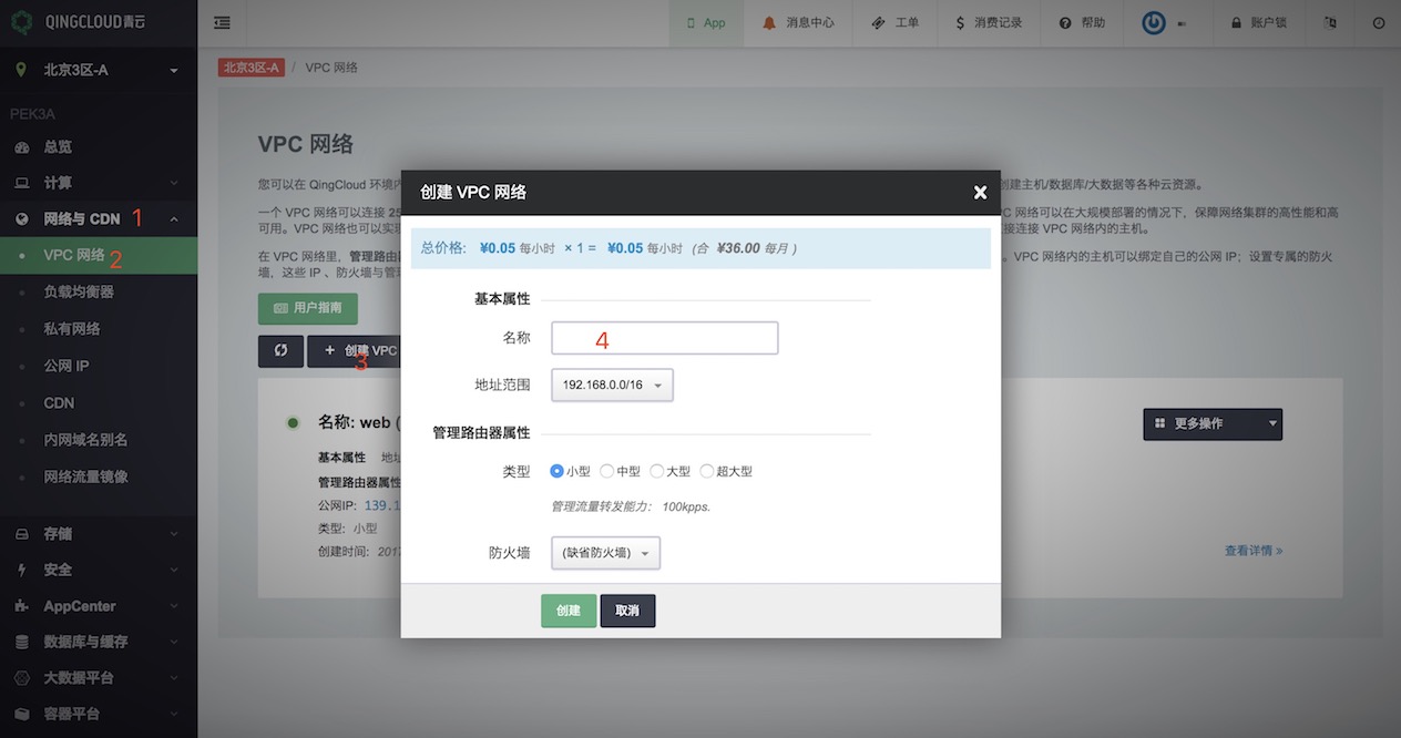 在青云用户控制台按如下方法创建 VPC,网络与 CDN ‣ VPC 网络 ‣ 创建 VPC 网络 ‣ 填入 VPC 网络名称 ‣ 创建,见下图步骤: