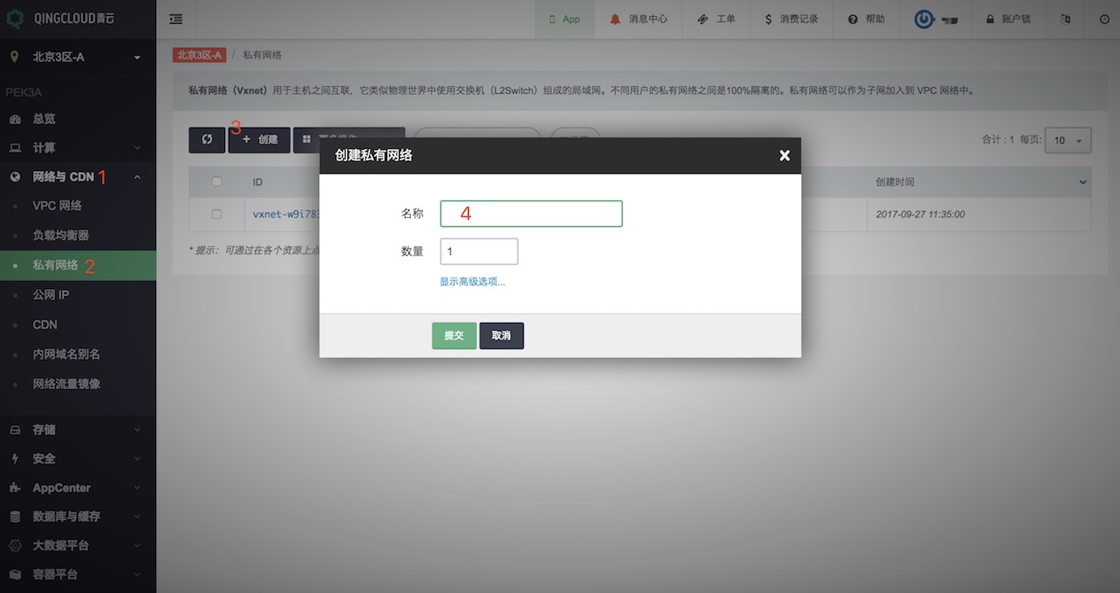 然后创建私有网络,网络与 CDN ‣ 私有网络 ‣ 创建 ‣ 填入私有网络名称 ‣ 提交,见下图步骤: