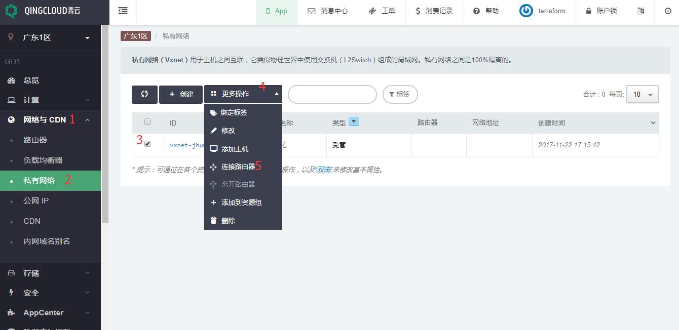 在 SDN 1.0 区,首先需要创建路由器,然后创建私有网络及加入私有网络到路由器中。