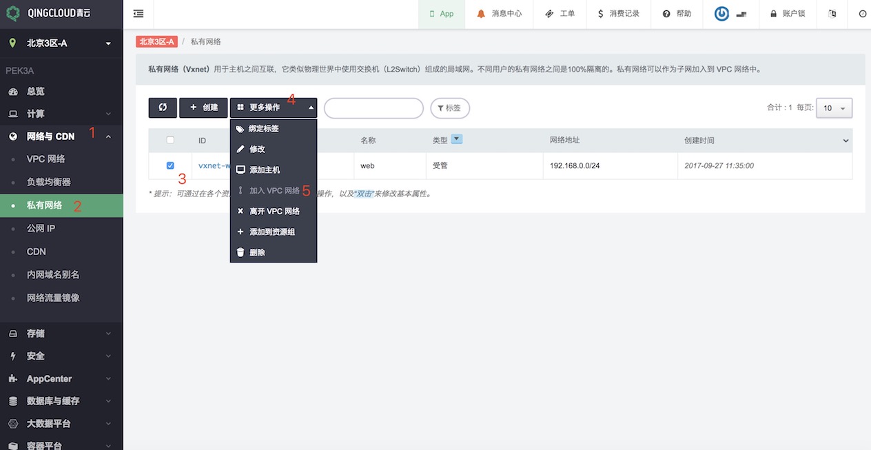 最后把该私有网络加入 VPC 中,网络与 CDN ‣ 私有网络 ‣ 选中私有网络 ‣ 更多操作 ‣ 加入 VPC 网络 ,见下图步骤: