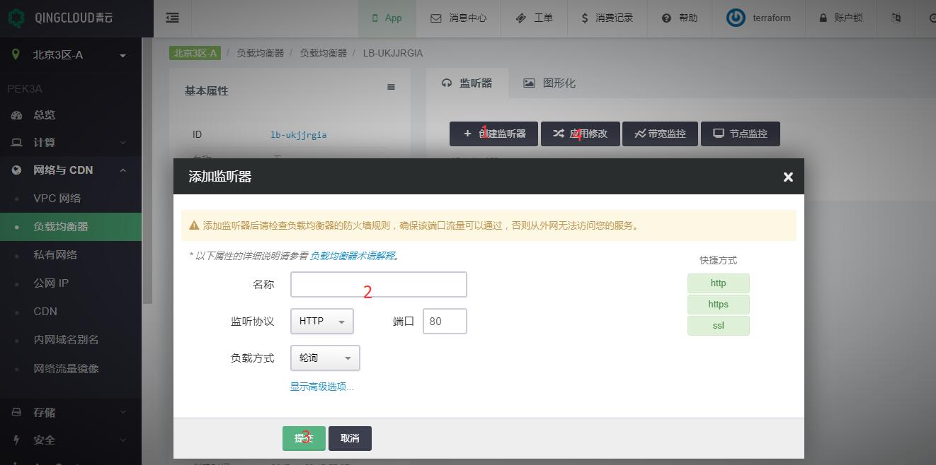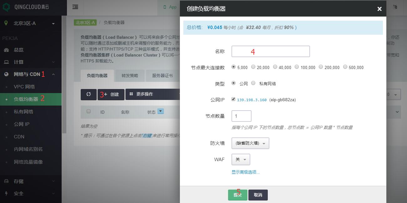网络与 CDN ‣ 负载均衡器 ‣ 创建 ‣ 填写信息 ‣ 提交, 见下图步骤: